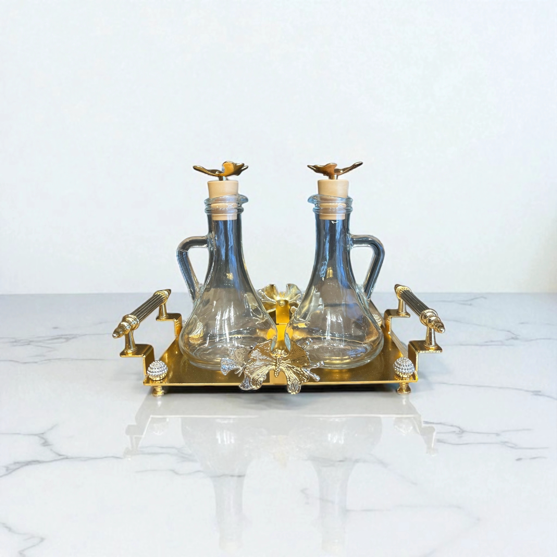 Şık tasarımı ve işlevsel yapısıyla sofralarınızda hem düzen hem estetik sağlar. Zeytinyağı, sirke, nar ekşisi ve soslarınızı hijyenik cam şişelerde muhafaza eder, altın kaplama detaylarıyla servislerinize zarafet katar.