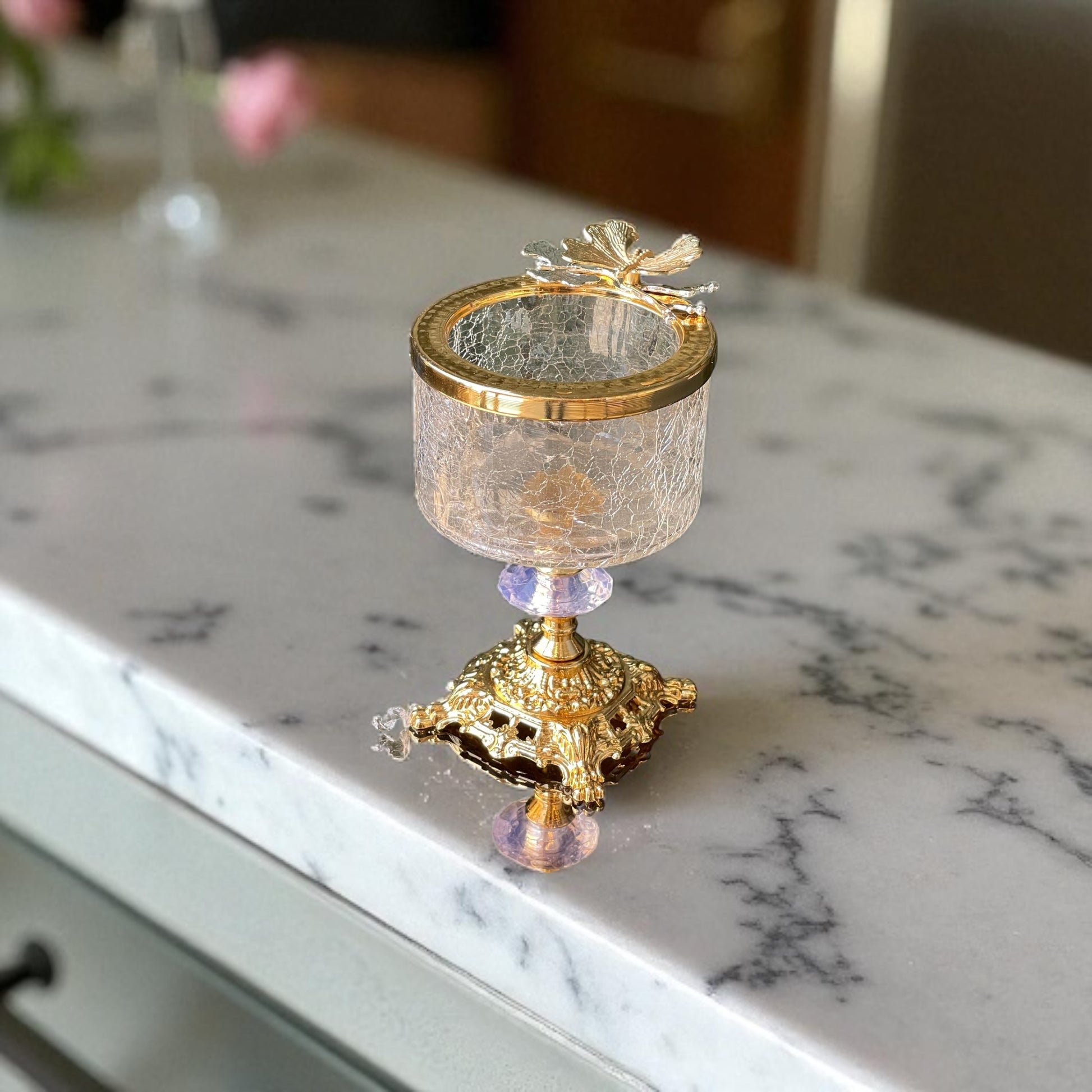 Altın renkli gösterişli ayaklar, çatlak camın büyüleyici dokusu ve zarif mor kristal detay…