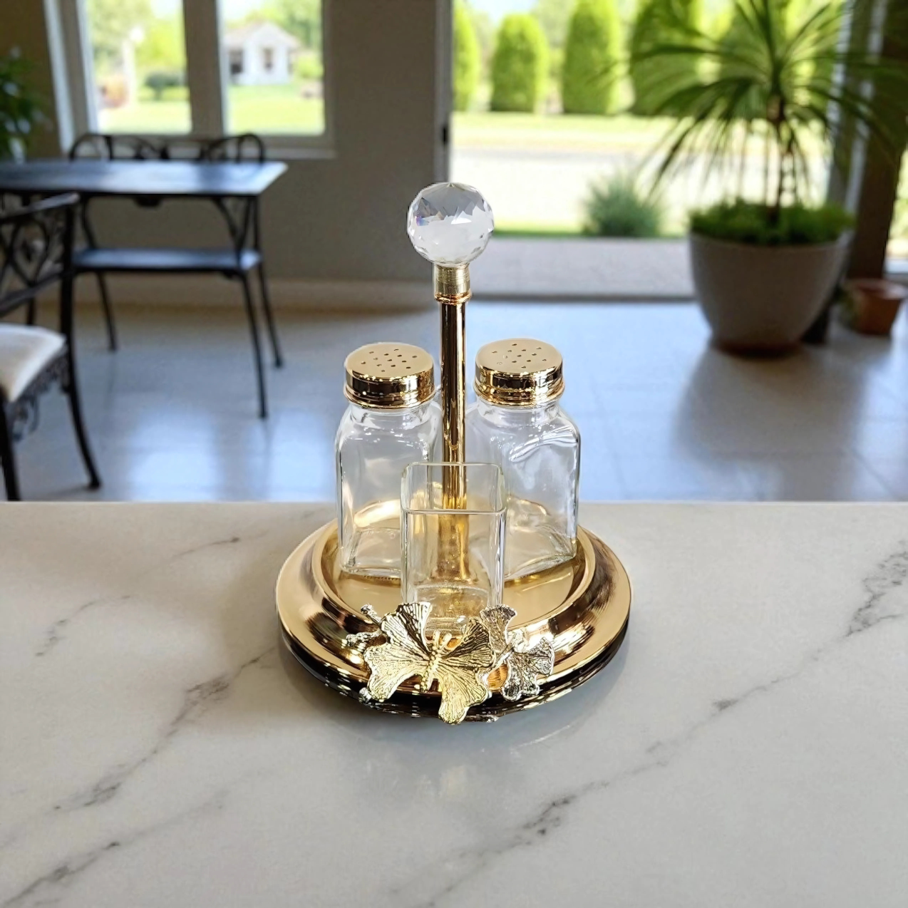 Şıklık ve işlevselliği bir arada sunan bu set, sofralarınızda hem pratik kullanım hem de estetik görünüm sağlar. Kristal topuz detayı ve kelebek motifli altın kaplama gövdesi ile mutfak ve yemek masalarınızda dikkat çeker. Tuzluk, biberlik, kürdanlık gibi farklı amaçlar için kullanılabilir.